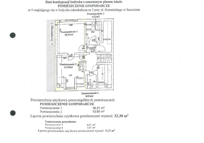 Lokal niemieszkalny – pomieszczenie gospodarcze składa się z dwóch pomieszczeń o pow. 32,30 m2 , położony na poddaszu budynku (III piętro). Do lokalu przynależą dwa pomieszczenia o pow. 4,31 m2 i 0,81 m2 . Wysokość pomieszczenia: 1,40 m – 2,55 m.